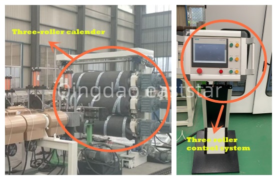 ABS多層共擠板材生產(chǎn)線的模具系統(tǒng)采用衣架式流道設(shè)計,模具寬度2200mm,配備精密的分配器,確保各層材料分布均勻。三輥壓光機配備Φ450×2500mm鏡面輥筒,輥面硬度HRC58-62,鍍鉻厚度0.08mm,通過特殊多流道設(shè)計確保溫度均勻。輥溫控制系統(tǒng)采用軟化凈水作為介質(zhì),溫控精度±1℃,配備三臺2.2KW熱水泵和三組12KW加熱器,為板材成型提供精確的溫度環(huán)境。